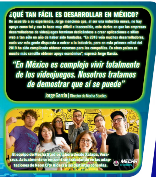 Building ExperienceOver the next three and a half years, the team worked hard, learning everything they could about the industry and game development, and attending as many events as possible. Jorge Garcia moderated a panel at PAX South, while Neon City Riders was selected for the Official Selection of PAX Rising at PAX East 2020 and the Indie Showcase 2020 Official Selection at PAX East. Mecha Studios became the first studio from southeastern Mexico to release a multi-platform game internationally, and today remains one of the most important references in Mexican game development.